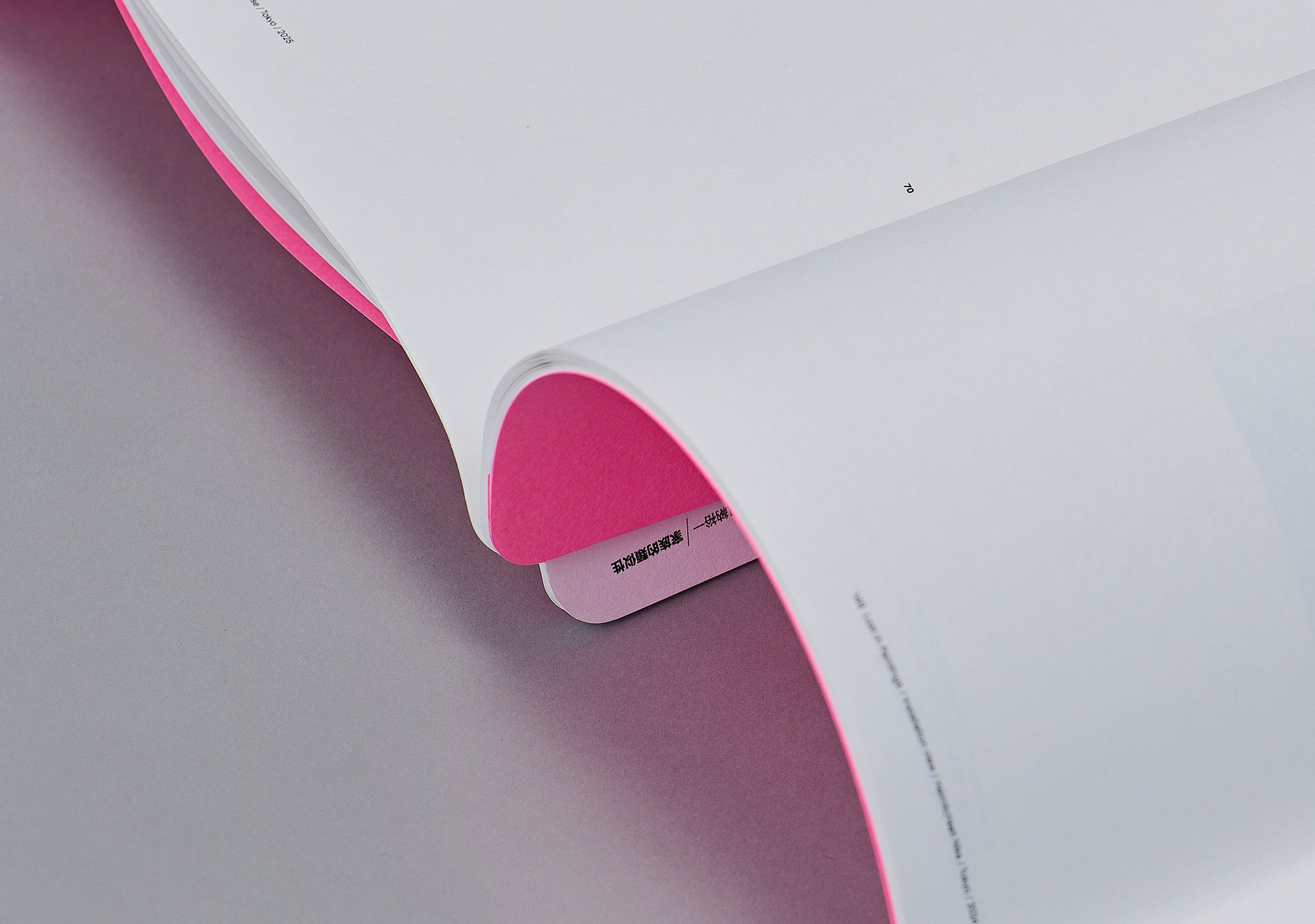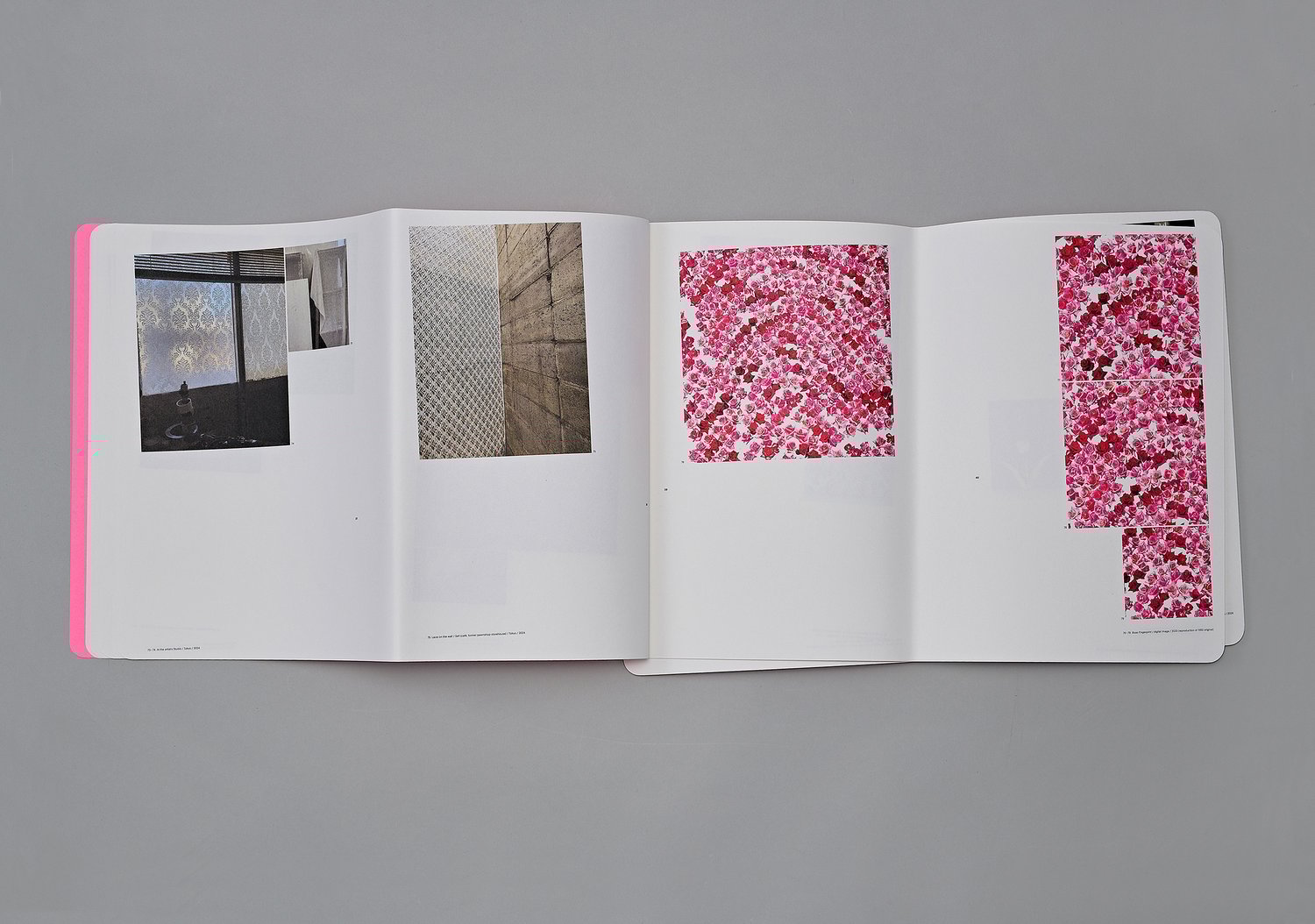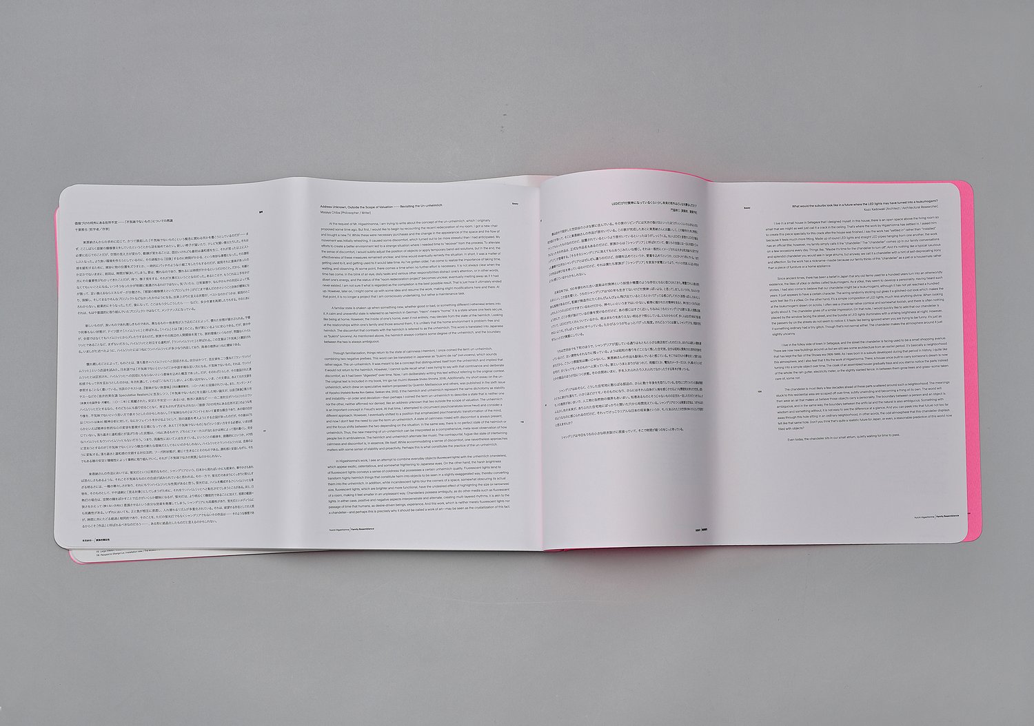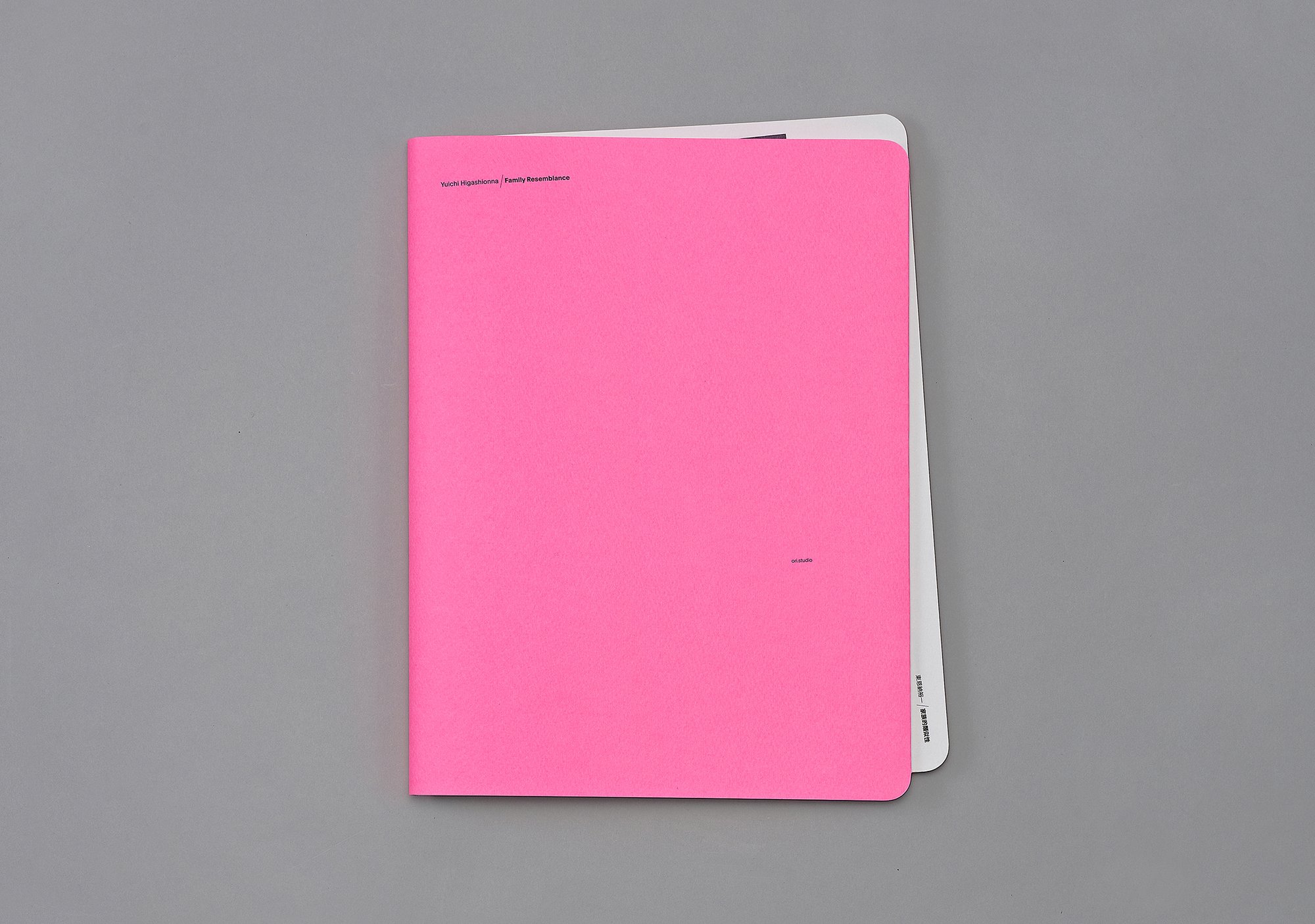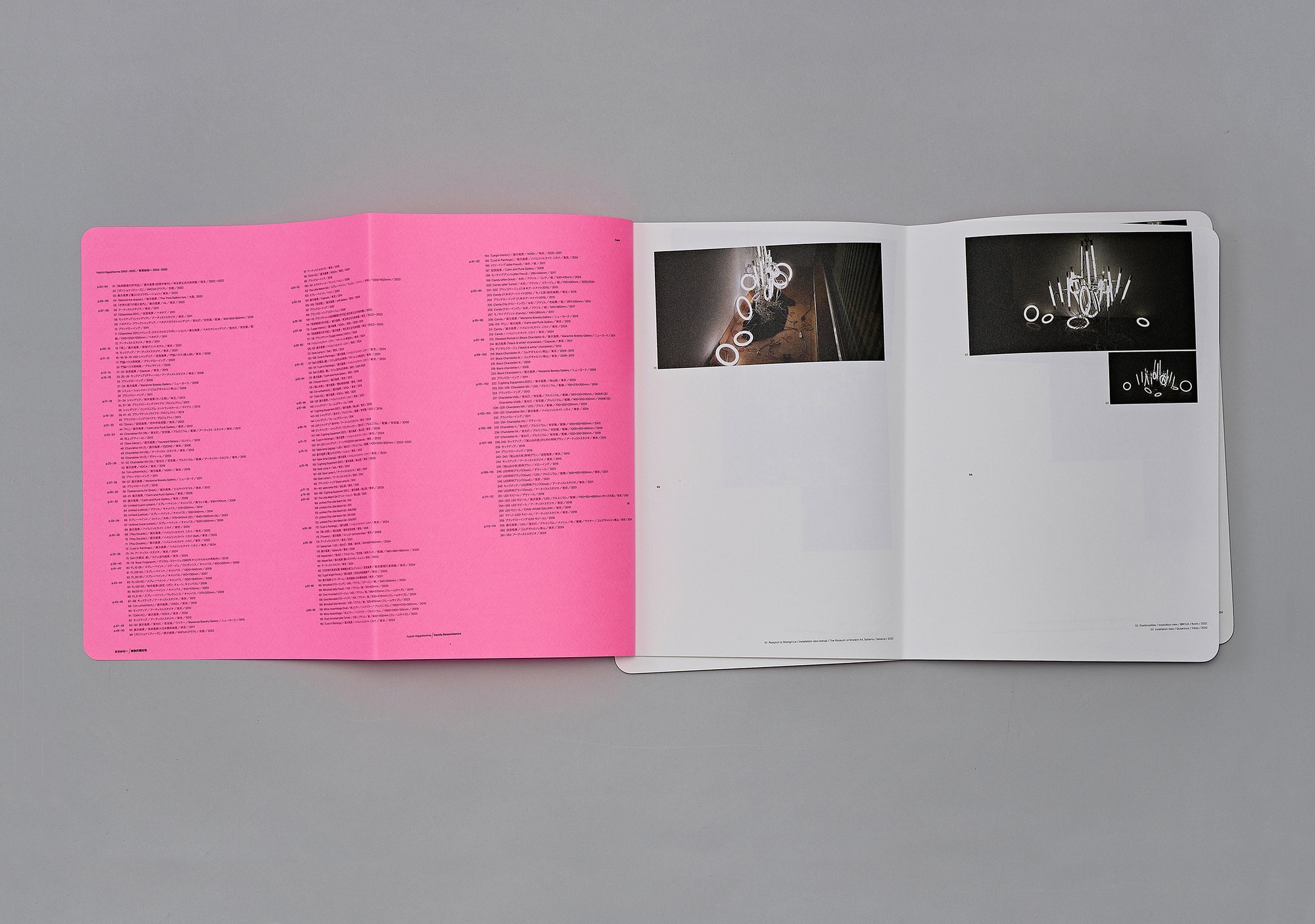 Incorporating 262 images from Higashionna’s personal archive—including completed work, exhibitions, process images, and drawings, this book, Family Resemblance, attempts to enter into its own physical state of “uncanniness” while drawing lines and connections that visualize how Higashionna’s vast, wide-ranging oeuvre is interconnected by a series of mutation-like relationships. Constructed out of two halves which are staple bound together at a slight angle, the book is initially turned inside-out so that readers are first confronted by the back cover, twisting the archetypical book form just enough so that it departs from its state of calmness into a kind of animistic “unheimlich”. The work, printed at the same slightly off-putting angle as the book is bound, is organized through perceived relationships rather than chronologically or by category. Balls made up of fluorescent bulbs mutate into balls made up of mirrors reflecting lines, mutating into those same lines pasted onto walls. From beginning to end, this shifting and transforming logic, a kind of subconscious network from which the output grows and develops, is illustrated and defined.