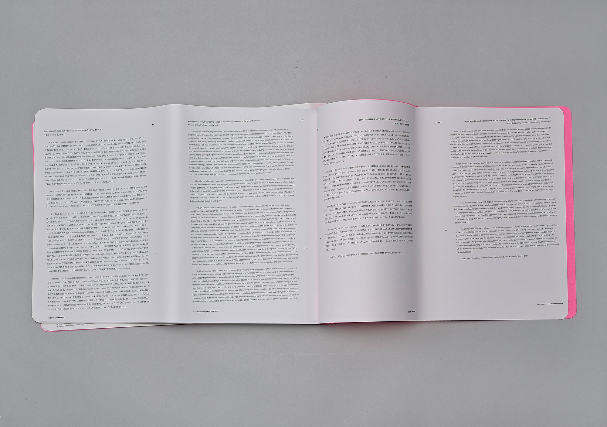 Essays by art writer Chie Sumiyoshi, philosopher Masaya Chiba, and architect Kadowaki Kozo add three unique perspectives to the ideas surrounding Higashionna’s practice and the uncanny, and how they are profoundly intertwined.